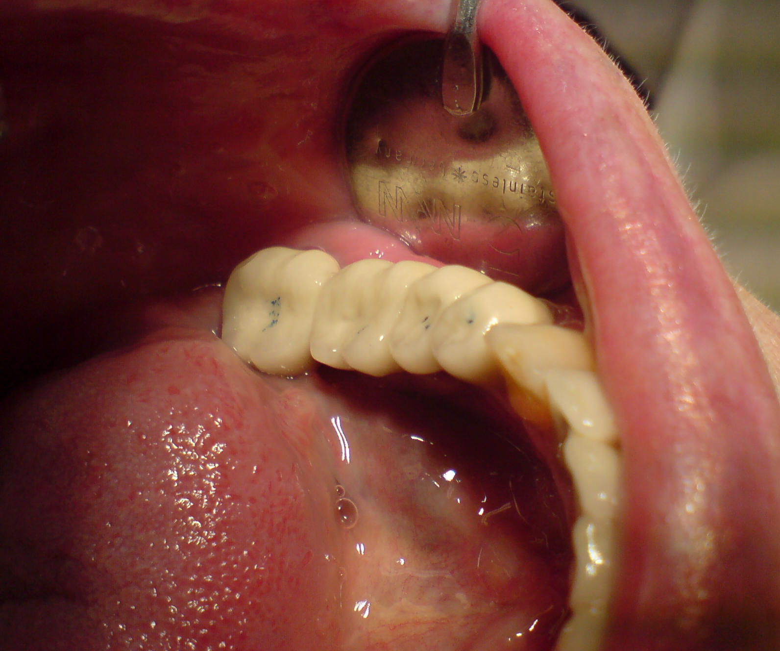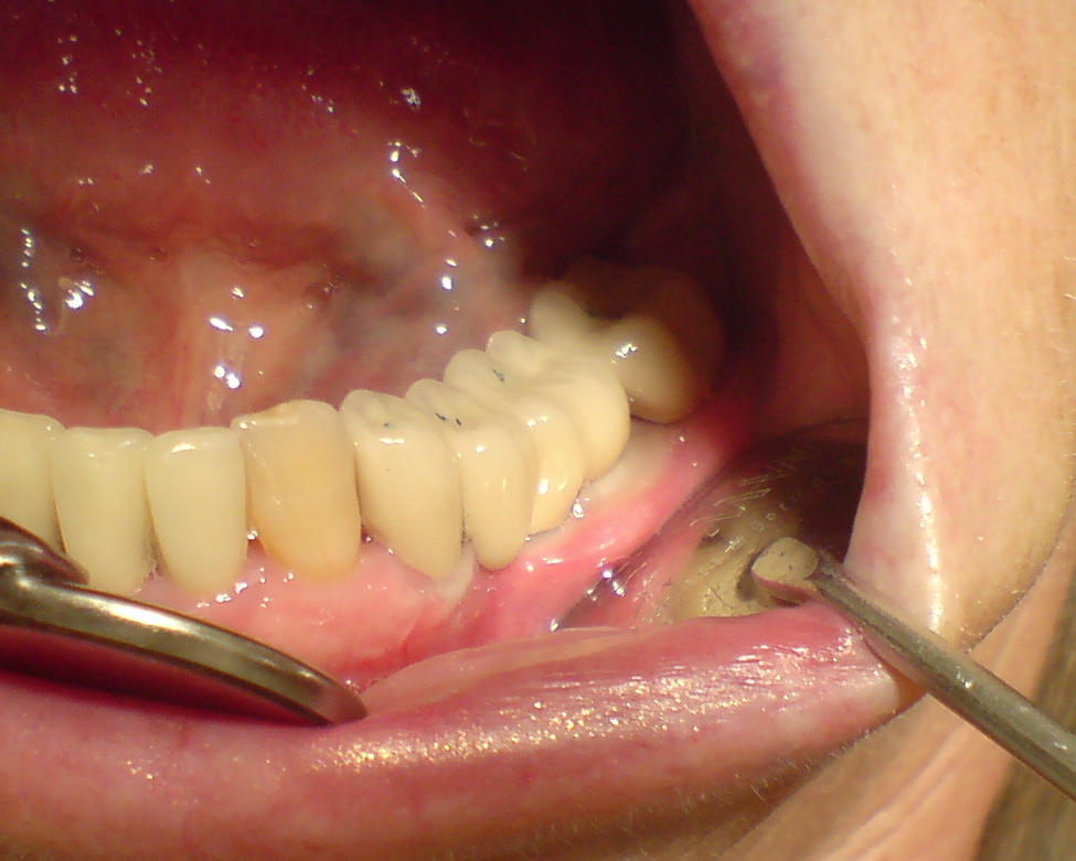 Festsitzender Zahnersatz auf 2 Implantaten und 2 eigenen Zähnen. Ausführung in Edelstahl (NEM) - Kosten ca. 3.500,- € abzgl. Kassenzuschuss. Knochenaufbaukosten in diesem Fall ca. 220,- €.